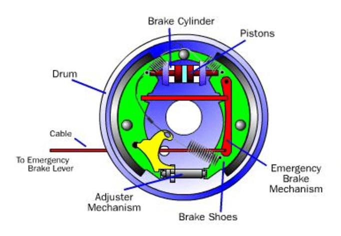 The systems are designed to decelerate the vehicle wheels movement through friction, thereby absorbing the kinetic energy at the wheels. The drum brakes are mainly used at the rear wheels of the passengers' cars and truck while the disc brakes are extremely used for the front brakes because of their greater directional stability. In brake drum, friction is caused by a set of shoes that presses against the inner surface of a rotating brake drum. Within the drum are shoes lined with friction material. The brake shoes moves against the inner surface of the brake drum by the action of the piston inside the wheel cylinder. The hydraulic fluid under pressure in the wheel cylinder moves the pistons which forces the brake shoes against the brake drum. The wheel cylinder and the shoes are mounted on the back plate.